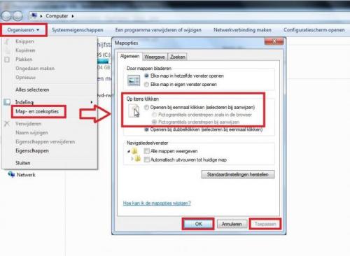 Op een bureaubladpictogram (snelkoppeling, map, document, prullenbak, enz, ...) dien je altijd twee keer (dubbel) te klikken alvorens het gekozen item zich opent. Sommigen onder ons werken liever met een enkele klik, wat vrij makkelijk in te stellen is. Open eerst en vooral je verkenner : dit doe je door je Windows-toets in te duwen samen met de letter E. Wanneer je verkenner zich heeft geopend kies je bovenaan links voor Organiseren, dan kies je voor Map- en zoekopties. In het venster dat zich nu opent zet je een bolletje voor Openen bij eenmaal klikken (tabblad Algemeen). Als je dit hebt uitgevoerd bevestig je onderaan door eerst op Toepassen te klikken, nadien klik je op OK. Na het uitvoeren van deze aanpassing bedien je je bureaubladpictogrammen met een enkele klik. Als je niet tevreden bent met deze instelling kan je uiteraard nog altijd terug naar de klassieke manier door het bolletje opnieuw bij Openen bij dubbelklikken te plaatsen, waarna je dan op Toepassen en OK klikt.
