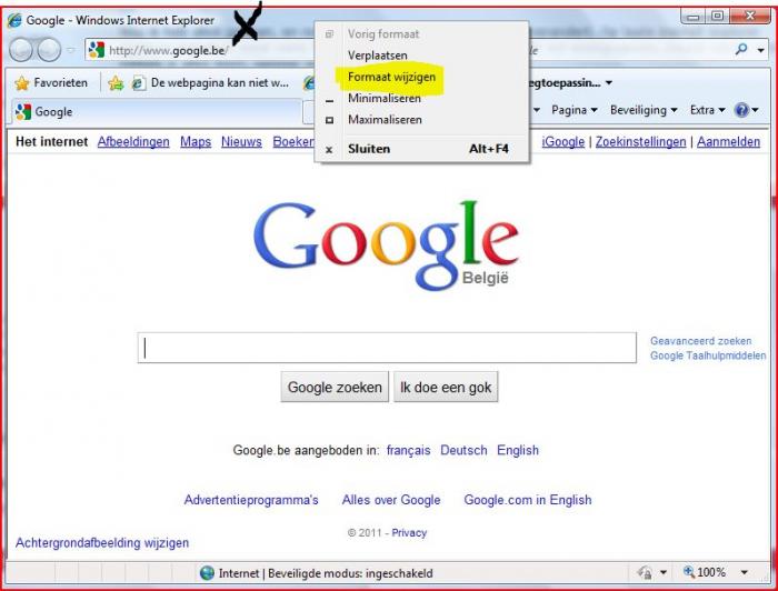 12. Hoi koalaM, welkom op PCH... ;-) Open je Internet Explorer en zet je cursor in het verkleinde venster van Internet Explorer ter hoogte van het kruisje dat ik gemarkeerd heb op de afbeelding hier onder. Nu klik je met je rechter muisknop en je selecteert dan 'formaat wijzigen'. De cursor verandert nu van uitzicht. Je neemt nu telkens één zijde van het venster 'vast' (met de gewijzigde cursor) en sleept het venster tot op de maximale grootte. Voor elke wijziging van de grootte (naar links, rechts, boven...) klik je opnieuw bovenaan en selecteer je opnieuw 'formaat wijzigen', tot dat je terug op normale venstergrootte zit. Als je ganse scherm gevuld is met Internet Explorer, sluit je het scherm af. Wanneer je nu Internet Explorer opent moet het scherm meteen maximaal openen.