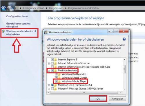 20. Klik op start (Windowsknop links onderaan) --> configuratiescherm --> programma's --> programma's en onderdelen. Klik nu in de linker kolom op Windows-onderdelen in-of uitschakelen. Er opent zich een nieuw kleiner schermpje, hier klik je op het plusteken voor Mediaonderdelen...haal het vinkje weg bij Windows Media Player en bevestig met een klik op ok. Herstart de pc en ga opnieuw naar Windows-onderdelen in-of uitschakelen...plaats het vinkje bij Windows Media Player terug en bevestig opnieuw met een klik op ok.