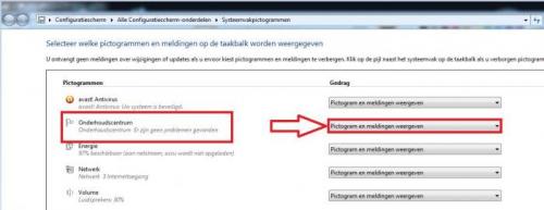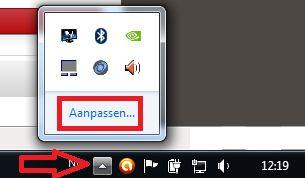 10. Klik in de taakbalk op het driehoekje en klik dan op aanpassen. Er opent zich een volgend scherm...kijk daar de instelling na van het pictogram van het Onderhoudscentrum...dit dient te zijn : pictogram en meldingen weergeven. Bevestig de nieuwe instelling door onderaan op ok te klikken.