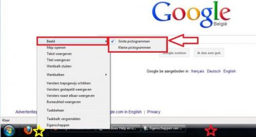 Er zijn inderdaad verschillen tussen Windows Vista en Windows 7 om die aanpassing uit te voeren. Hieronder vind je een afbeelding...klik eerst met je rechter muisknop in de taakbalk ter hoogte van de rode ster : er opent zich een menu, indien er daar een vinkje staat voor taakbalk vergrendelen haal je dat weg door er op te klikken...de taakbalk is nu ontgrendeld. Zolang de taakbalk vergrendeld is kan je de aanpassingen niet uitvoeren. Nu klik je met rechts ter hoogte van de gele ster...het menu uit onderstaande afbeelding verschijnt en nu kan je bij beeld kiezen tussen kleine en grote pictogrammen. Indien je taakbalk vergrendeld was, kan je die nu opnieuw vergrendelen door terug in de taakbalk te klikken ter hoogte van de rode ster en te kiezen voor taakbalk vergrendelen.