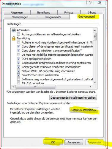 13. Hallo den dikke lu, zet je Internet Explorer eens terug naar zijn basisinstellingen. Klik op 'extra' --> 'internetopties' en ga dan naar tabblad 'geavanceerd' Klik onderaan op de knop 'opnieuw instellen', klik nogmaals op 'opnieuw instellen'. Nadien klik je op 'toepassen' en dan op 'ok'. Nu herstart je je Internet Explorer. Hieronder een foto ter verduidelijking, je kan hem vergroten door er op te klikken. Grtjs.