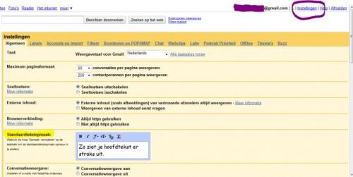 Het is mogelijk in Gmail je standaard lettertype (standaardtekstopmaak) te wijzigen en te bewaren, zodat je dat niet telkens opnieuw manueel hoeft te doen. Volledigheidshalve vermeld ik dat er aangegeven wordt dat het om een experimentele functie gaat, maar ik heb ze met volle tevredenheid uitvoerig getest op diverse accounts. Eerst en vooral log je in op je Gmail-account. Rechts bovenaan klik je op 'instellingen' , daarna ga je naar het tabblad 'labs'. Nu heb je twee mogelijkheden : * ofwel scrol je naar beneden tot bij 'standaardtekstopmaak' * ofwel geef je in het zoekraam bij 'een lab zoeken' 'standaardtekstopmaak' in. Wanneer je bij het lab 'standaardtekstopmaak' komt vink je 'inschakelen' aan. Nu bevestig je dit onderaan links door op 'wijzigingen opslaan' te klikken. Je komt automatisch terug op het 'postvak IN-scherm' uit van je account. Selecteer opnieuw 'instellingen' links bovenaan. In het tabblad 'algemeen' kan je nu bij 'standaardtekstopmaak' je lettertype, grootte, enz instellen. Er komt meteen een voorbeeld in het venstertje. Als je tevreden bent met de nieuwe instellingen bevestig je deze door onderaan op 'wijzigingen opslaan' te klikken. Veel plezier...