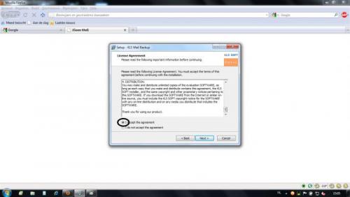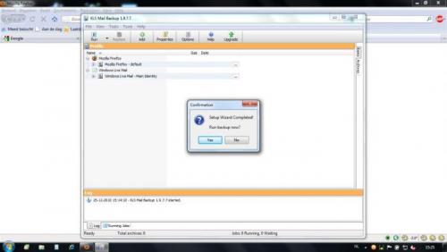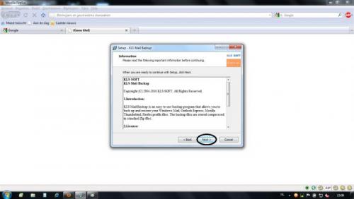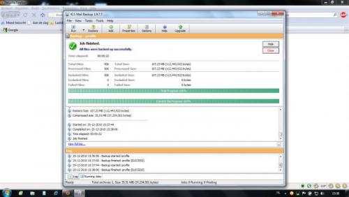Wie graag een héél basic back-upprogramma als aanvulling heeft op andere back-upprogramma's kan perfect zijn gading vinden bij KLS Mail Backup. Inderdaad, héél basic : dit programma maakt enkel een back-up van je e-mailprogramma en je browserinstellingen. Bij de e-mailprogramma's wordt er ondersteuning geboden aan de meest voorkomende programma's : Windows (Live) Mail, Incredimail, Outlook Express, Thunderbird... Je kan selecteren wat er precies van je e-mailprogramma moet veilig gesteld worden...meer wordt duidelijk in de screenshots. Idem dito voor wat betreft je browser(s) : ook hier bepaal je wat er veilig moet weggeschreven worden...de meest courante browsers worden ondersteund : IE, Firefox, Opera... Google Chrome wordt echter (nog niet?) ondersteund, maar dat ervaar ik persoonlijk niet meteen als een gemis... Alles wordt gecomprimeerd in ZIP-formaat en er is een testfunctie voorzien. Naar mijn ervaring dus een compact en vooral een snel programma : mijn eerste back-up van Windows Live Mail (Telenet-account) en browserinstellingen duurde exact 22 seconden... Ik liet alles wegschrijven op een externe harde schijf...dit kan je vrij aangeven en eventueel nadien probleemloos wijzigen, wegschrijven naar een andere partitie op de 'eigen' schijf kan dus ook perfect. En...ook niet onbelangrijk : het is een gratis programma. Downloaden kan je hier. Link naar de site van de makers van deze software : ( KLS Mail Backup - Freeware Outlook Express, Windows Live Mail, Thunderbird, Firefox backup ) Wil je nog meer info? : hier. Hier onder volgen nog een reeks screenshots waarin jullie de set-up kunnen volgen...je kan de afbeeldingen vergroten door er op te klikken. [ATTACH]8408[/ATTACH] Hier klik je op 'next'. [ATTACH]8411[/ATTACH] 'I accept', dan klik je op 'next'. [ATTACH]8410[/ATTACH] Je klikt op 'next'. [ATTACH]8409[/ATTACH] Je klikt op 'next'. [ATTACH]8414[/ATTACH] Idem, je klikt op 'next', tenzij je een andere map wil dan de default. [ATTACH]8413[/ATTACH] 'Create a desktop icon', dan 'next'. [ATTACH]8412[/ATTACH] 'Install' [ATTACH]8415[/ATTACH] 'Finish' [ATTACH]8416[/ATTACH] 'Ok' [ATTACH]8417[/ATTACH] Hier voeg je je e-mailprogramma ('s) toe, 'add' of 'add and close' [ATTACH]8418[/ATTACH] 'add & close' [ATTACH]8419[/ATTACH] 'OK' [ATTACH]8420[/ATTACH] Kies bestemming en map. [ATTACH]8421[/ATTACH] Set up beeindigd, je kan meteen aan de slag nu. [ATTACH]8422[/ATTACH] Job finished !...