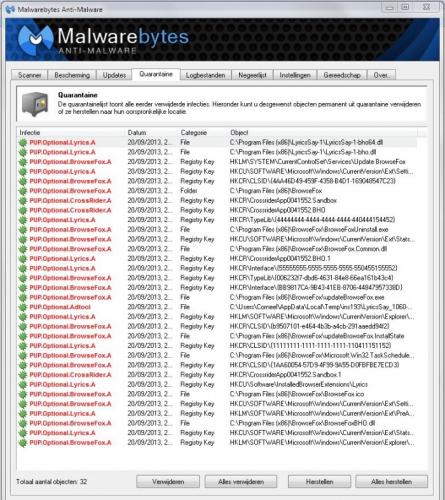 Beste, Sinds enkele dagen heb ik last van veel reclame tijdens het surfen op het net. Vensters met een waarschuwing over besmettingen en een harde schijf die bijna vol is waren schering en inslag. Gisteravond heb ik dan Malwarebytes zijn werk laten doen en die heeft 32 besmettingen gevonden (afbeelding). Deze heb ik in quarantaine geplaatst. Daarna had ik geen last meer van reclame. Nu ben ik er wel niet zeker van of alle sporen van de besmetting wel degelijk verdwenen zijn. Tussen mijn software staat wel een programma dat ik naar mijn weten niet zelf geïnstalleerd heb (afbeelding). Wil onderstaande logs eens nakijken of er geen “beestjes” meer in zitten? Reeds hartelijk dank bij voorbaat. Log Malwarebytes Malwarebytes Anti-Malware 1.75.0.1300 www.malwarebytes.org Databaseversie: v2013.09.20.07 Windows 7 Service Pack 1 x64 NTFS Internet Explorer 10.0.9200.16686 Corneel :: CORNEEL-PC [administrator] 21/09/2013 9:25:22 mbam-log-2013-09-21 (09-25-22).txt Scan type: Snelle scan Ingeschakelde scan opties: Geheugen | Opstartitems | Register | Bestanden en mappen | Heuristiek/Extra | Heuristiek/Shuriken | PUP | PUM Uitgeschakelde scan opties: P2P Objecten gescand: 220685 Verstreken tijd: 2 minuut/minuten, 56 seconde(n) Geheugenprocessen gedetecteerd: 0 (Geen kwaadaardige objecten gedetecteerd) Geheugenmodulen gedetecteerd: 0 (Geen kwaadaardige objecten gedetecteerd) Registersleutels gedetecteerd: 0 (Geen kwaadaardige objecten gedetecteerd) Registerwaarden gedetecteerd: 0 (Geen kwaadaardige objecten gedetecteerd) Registerdata gedetecteerd: 0 (Geen kwaadaardige objecten gedetecteerd) Mappen gedetecteerd: 0 (Geen kwaadaardige objecten gedetecteerd) Bestanden gedetecteerd: 0 (Geen kwaadaardige objecten gedetecteerd) (einde) Log HijachThis Logfile of Trend Micro HijackThis v2.0.4 Scan saved at 9:30:57, on 21/09/2013 Platform: Windows 7 SP1 (WinNT 6.00.3505) MSIE: Internet Explorer v10.0 (10.00.9200.16686) Boot mode: Normal Running processes: C:\Program Files (x86)\Common Files\Microsoft Shared\Ink\TabTip32.exe C:\Program Files (x86)\4Team Corporation\Safe PST Backup\SafePSTBackup.exe C:\Program Files (x86)\ION\EZ VHS Converter\MediaTVMonitor.exe C:\Program Files (x86)\Intel\Intel® Rapid Storage Technology\IAStorIcon.exe C:\Program Files (x86)\MyHeritage\Bin\FTBCheckUpdates.exe C:\Program Files (x86)\Common Files\ArcSoft\Connection Service\Bin\ACDaemon.exe C:\Program Files (x86)\Common Files\Java\Java Update\jusched.exe C:\Program Files (x86)\Common Files\ArcSoft\Connection Service\Bin\ArcCon.ac C:\Program Files (x86)\Malwarebytes' Anti-Malware\mbamgui.exe C:\Program Files (x86)\Internet Explorer\IEXPLORE.EXE C:\Program Files (x86)\Internet Explorer\IEXPLORE.EXE C:\Program Files (x86)\Microsoft Office\Office14\OUTLOOK.EXE C:\Program Files (x86)\Microsoft Office\Office14\WINWORD.EXE C:\Program Files (x86)\Trend Micro\HiJackThis\HiJackThis.exe R1 - HKCU\Software\Microsoft\Internet Explorer\Main,Default_Page_URL = MSN NL: Hotmail, Outlook, Skype, Messenger, het laatste nieuws, entertainment en meer! R0 - HKCU\Software\Microsoft\Internet Explorer\Main,Start Page = https://www.google.be/ R1 - HKLM\Software\Microsoft\Internet Explorer\Main,Default_Page_URL = MSN NL: Hotmail, Outlook, Skype, Messenger, het laatste nieuws, entertainment en meer! R1 - HKLM\Software\Microsoft\Internet Explorer\Main,Default_Search_URL = Bing R1 - HKLM\Software\Microsoft\Internet Explorer\Main,Search Page = Bing R0 - HKLM\Software\Microsoft\Internet Explorer\Main,Start Page = MSN NL: Hotmail, Outlook, Skype, Messenger, het laatste nieuws, entertainment en meer! R0 - HKLM\Software\Microsoft\Internet Explorer\Search,SearchAssistant = R0 - HKLM\Software\Microsoft\Internet Explorer\Search,CustomizeSearch = R0 - HKLM\Software\Microsoft\Internet Explorer\Main,Local Page = C:\Windows\SysWOW64\blank.htm R1 - HKCU\Software\Microsoft\Internet Explorer\Main,Window Title = Windows Internet Explorer wordt aangeboden door MSN and Bing R0 - HKCU\Software\Microsoft\Internet Explorer\Toolbar,LinksFolderName = F2 - REG:system.ini: UserInit=userinit.exe, O2 - BHO: Groove GFS Browser Helper - {72853161-30C5-4D22-B7F9-0BBC1D38A37E} - C:\PROGRA~2\MICROS~2\Office14\GROOVEEX.DLL O2 - BHO: Java Plug-In SSV Helper - {761497BB-D6F0-462C-B6EB-D4DAF1D92D43} - C:\Program Files (x86)\Java\jre7\bin\ssv.dll O2 - BHO: Aanmeldhulp voor Microsoft-account - {9030D464-4C02-4ABF-8ECC-5164760863C6} - C:\Program Files (x86)\Common Files\Microsoft Shared\Windows Live\WindowsLiveLogin.dll O2 - BHO: URLRedirectionBHO - {B4F3A835-0E21-4959-BA22-42B3008E02FF} - C:\PROGRA~2\MICROS~2\Office14\URLREDIR.DLL O2 - BHO: Java Plug-In 2 SSV Helper - {DBC80044-A445-435b-BC74-9C25C1C588A9} - C:\Program Files (x86)\Java\jre7\bin\jp2ssv.dll O2 - BHO: DVDVideoSoft.WebPageAdjuster - {EE932B49-D5C0-4D19-A3DA-CE0849258DE6} - C:\Program Files (x86)\Common Files\DVDVideoSoft\bin\IEDownloadMenuAndBtns.dll O4 - HKLM\..\Run: [iAStorIcon] C:\Program Files (x86)\Intel\Intel® Rapid Storage Technology\IAStorIcon.exe O4 - HKLM\..\Run: [APSDaemon] "C:\Program Files (x86)\Common Files\Apple\Apple Application Support\APSDaemon.exe" O4 - HKLM\..\Run: [Adobe ARM] "C:\Program Files (x86)\Common Files\Adobe\ARM\1.0\AdobeARM.exe" O4 - HKLM\..\Run: [Family Tree Builder Update] C:\Program Files (x86)\MyHeritage\Bin\FTBCheckUpdates.exe O4 - HKLM\..\Run: [ArcSoft Connection Service] C:\Program Files (x86)\Common Files\ArcSoft\Connection Service\Bin\ACDaemon.exe O4 - HKLM\..\Run: [sunJavaUpdateSched] "C:\Program Files (x86)\Common Files\Java\Java Update\jusched.exe" O4 - HKCU\..\Run: [sidebar] C:\Program Files\Windows Sidebar\sidebar.exe /autoRun O4 - HKCU\..\Run: [RESTART_STICKY_NOTES] C:\Windows\System32\StikyNot.exe O4 - HKCU\..\Run: [safe PST Backup] "C:\Program Files (x86)\4Team Corporation\Safe PST Backup\SafePSTBackup.exe" /autostart O4 - HKCU\..\Run: [smartschool Me!] C:\Program Files (x86)\Smartbit bvba\Smartschool Me!\Smartschool Me!.exe O4 - HKCU\..\Run: [GarminExpressTrayApp] "C:\Program Files 