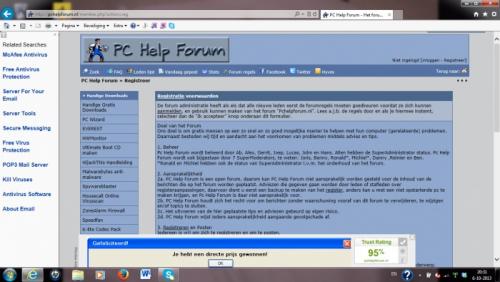 Hallo allemaal, Ik heb sinds kort een aantal problemen als ik op het internet wil surfen. Sinds 2.5 jaar heb ik een HP G62 laptop en sinds een maand heb ik allemaal rare pop ups die verschijnen en ik weet niet hoe ik dit kan bestrijden. Ik doe regelmatig een scan via PC VEILIG van Kpn. In de bijlage heb ik de pop ups bijgevoegd, zouden jullie mij kunnen helpen hoe ik dit kan bestrijden?