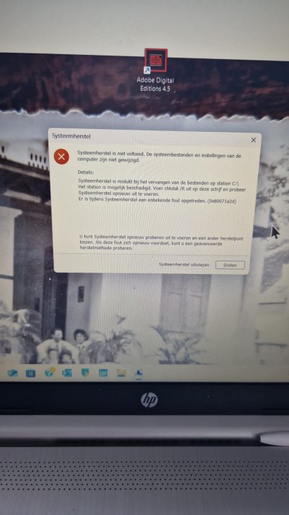 3. Een een vriendin heeft problemen met de taal van haar pc en ik adviseerde haar om een systeemherstel te doen en de pc terug te zetten naar een datum van toen de pc nog met de goede taal startte. Dat herstellen lukte niet, ook niet toen ik dat liet doen in veilige modus. In beide gevallen kreeg ze de volgende melding. Zie de afbeelding. Is er nog een andere mogelijkheid? Want misschien gaat het alleen om het programma Word. Dat kunnen we dan wel weer oplossen. Maar hoe dan ook lijkt het me handig als je systeemherstel kan uitvoeren. Die vriendin woont 100 km hier vandaan. Dus ik kan er ook niet even heen. Als het alleen om Word gaat, kan ik het misschien op afstand doen. Maar dat is dan weer een volgende keer. Gerda