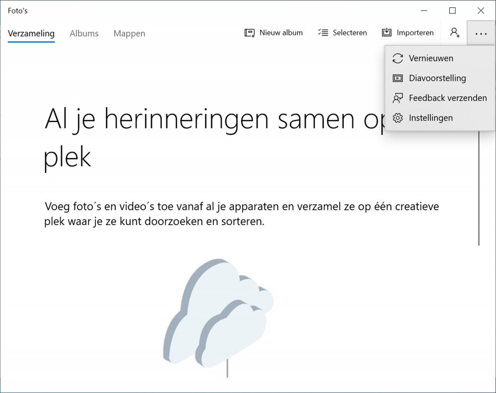 Ik stuur hierbij een afbeelding van mijn app foto's op mijn nieuwe laptop. Als ik die maximaliseer, gebeurt er niets. Het beeld blijft hetzelfde. Er is ook geen kopje 'meer'. Er zijn rechtsboven nog wat puntjes. Daarop heb ik geklikt en in mijn afbeelding laten zien.