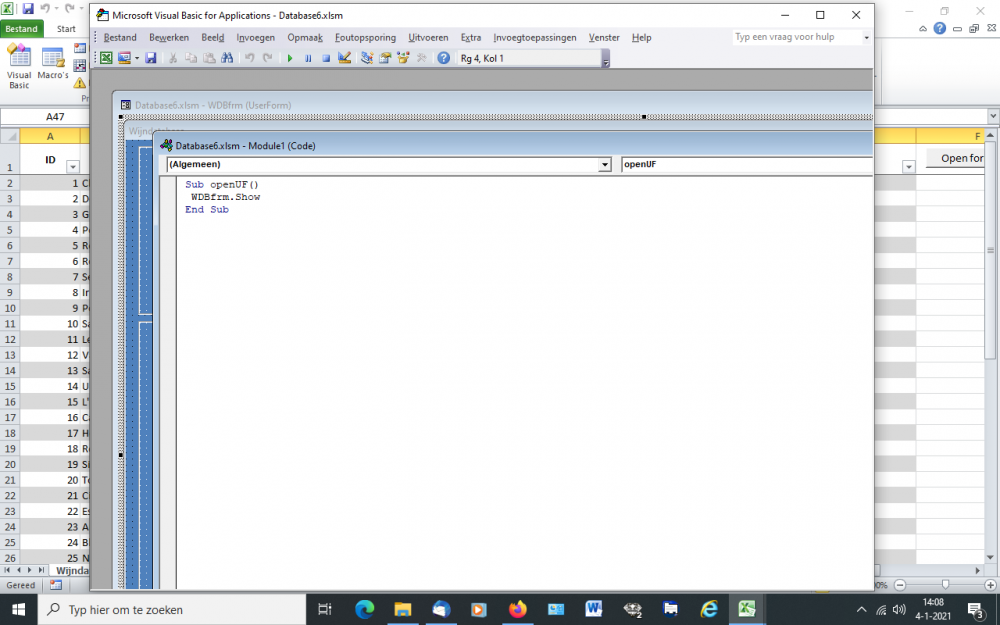 Ik heb in het spread sheed scherm op F11 gedrukt en toen kreeg ik het bijgevoegde plaatje. Ik heb natuurlijk ook nog op formulier gedrukt en toen kreeg ik het gewone formulier zonder sluitknop. Ik heb hiervoor ook nog een keer het formulier gehad waarbij ik de rechterkant smaller kon maken maar dat kon ik niet opslaan en ik weet ook niet hoe ik daar gekomen ben. Dus ik blijf maar gewoon proberen. Ik moet waarschijnlijk wel met macro's aan de gang maar daar heb ik nog niet mee gewerkt. Wel vroeger in een ander programma. Niet onder Excel.