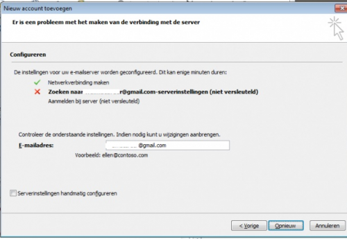 1. Helaas, exact volgens handmatige instructies gedaan, krijg dezelfde melding, zie bijlage. Bij het invoeren van een nieuw mailadres, wordt gevraagd naar een wachtwoord. Dit is toch het wachtwoord dat ik in dit geval bij mijn gmail account bij dit emailadres heb?
