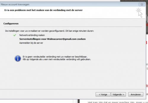 5. Hallo, 'k Wil aan mijn Outlook 2010 een gmail adres toevoegen om eventueel een bericht aan te maken vanuit Outlook, doch met verzendmailadres van gmail. Vanuit Bestand > Accountinstellingen > Accountinstellingen > Email > Nieuw, heb ik het gmail adres + het wachtwoord dat bij dit gmail account hoort ingevoerd, doch krijg steeds de melding dat er geen versleutelde verbinding met mijn mailserver beschikbaar is. Hoe kan dat? En hoe los ik dit op?