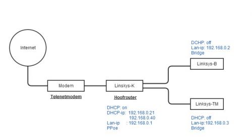 Nee, dus ik heb eerst mijn telenet router/modem dan gaat dat internet naar mijn ethernetpoort van mijn linksys 1 (die zou ik als hoofdrouter willen, dus dat alleen daar de dhcp aanstaat) en dan vertrekken router 2 en 3 uit router 1 (die ik eigenlijk als een soort switch gebruik dan) Snapt u? In bijlage vind u een overzichtje van hoe ik denk dat de instellingen er ongeveer moeten uitzien.