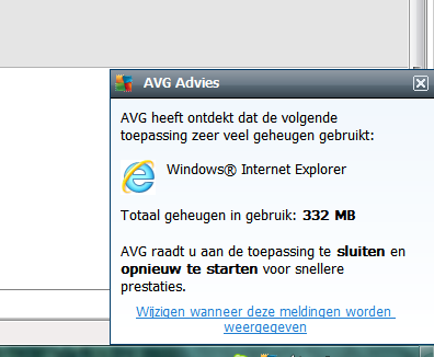 Hello !Ik krijg bij het surfen met IE 9 om de averklap een boodschap van AVG advies op het scherm Het vermeld " AVG heeft ondekt dat de volgende toepassing zeer veel geheugen gebruikt , Windows Internet Explorer " Wat kan ik daar aan doen ? Ik heb dat probleem niet met Chrome . Heb hier een screen afb. van de boodschap bijgevoegd !