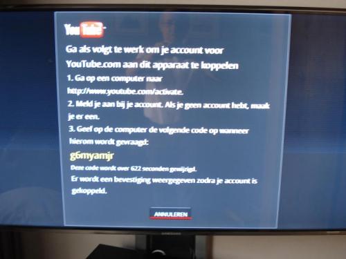 Hello ik weet niet of ik op het juiste forum zit maar ik wil het proberen . Ik bezit een samsung smart TV ( serie 700 ) en nu probeer ik mijn eigen youtube account te koppelen met dit ding Dan zou het mogelijk zijn om mijn eigen filmpjes en favouriten geplaatst op youtube op mijn samsung TV te bekijken Maar dat lukt me dus niet -- en ik heb een beetje gegoogeld en het schijnt een veel voorkomend probleem te zijn Heb ook al bericht gelaten op de site van Samsung , tot hiertoe geen respons Iemand hier een idee of dat op te lossen is ? In bijlage de tekst die ik krijg op mijn TV -- hoe te koppelen met youtube ! Heb zelf een nieuw account gemaakt en terug gebrobeerd -- geen result ! Als ik mijn youtube account open , vond ik daar niets in terug om het gekregen paswoord van mijn samsung TV in te voegen ? Dat is het ongeveer -- ofwel zit de fout bij samsung of bij youtube ( hoe die contacteren ?? ) ofwel doe ik iets fout Bedankt bij voorbaat en sorry als ik niet op het juiste forum zit ! Grt. Rob