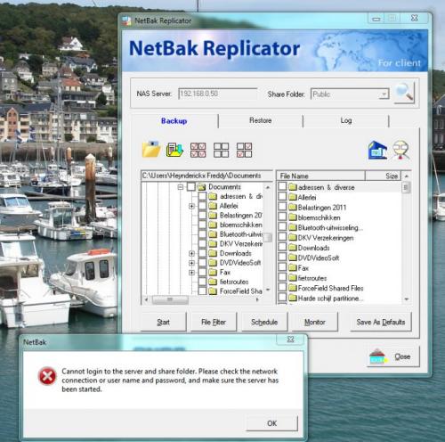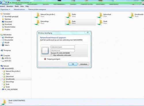 Hello ProMind . Ja je idee was juist -- firewall zone alarm en nadien de firewall van windows uitgeschakkeld !! en daar was de Nas terug in verkenner Maar inloggen van daaruit werkt nog niet -- neemt geen enkel passwoord aan Zie Afb. Ook NetBack replicator logt niet in -- hij kan niet inloggen zegt hij :-( Good Lord -- wat een problemen om een Nas aan de gang te krijgen Rob.