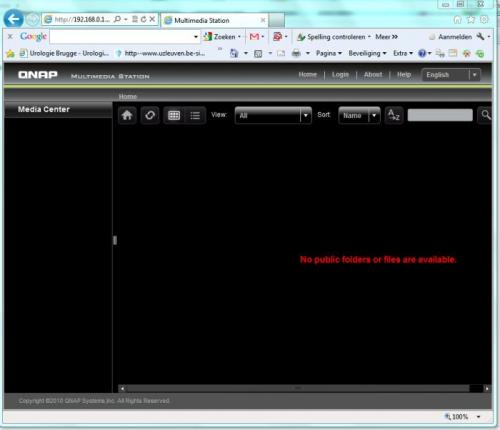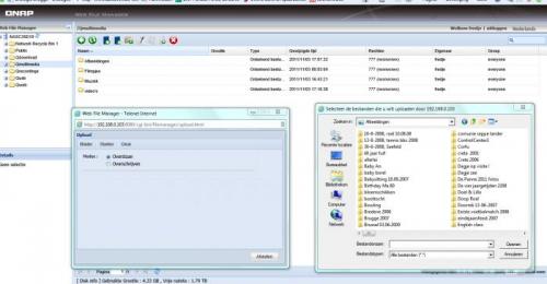 Hello ; Heb een qnapTS 110 Turbonas aangekocht maar heb de installatie een beetje onderschat denk ik Heb dat ding al geinstalleerd , gekoppeld aan mijn Dlink 600 router en is zichtbaar op mijn laptop en smart TV samsung ! Heb ook twee films en een map met foto's geupload naar qmutimedia met het ingbouwde program ,( zie afbeelding ) voor een testje en dat is gelukt ! Ik kan die films en foto's bekijken op mijn TV vanuit de Nas . So far so good , maar nu de vragen . 1: hoe kan ik een vast Ip adres verkrijgen ( nu bereik ik de nas met het program Qnap finder ) ? 2: kan iedereen dan aan mijn gegevens 3:is er een mogelijkheid om de map afbeeldingen in zijn geheel te uploaden ? 4: hoe upload ik al mijn documenten , foto's filmpjes enz -- naar de nas , is daar een program voor ? en een volledige back-up van mijn laptop naar de Nas , is dat mogelijk ? 5: moet ik dat antivirusprogram inschakkelen ? 6: Bestaat er een nederlandse handleiding over Qnap ts 110 ? Dat is het voor nu , heb al wat info verkregen in de andere Nas topics en ik hoop dat Stegi thuis is Bedankt bij voorbaat ! Rob.