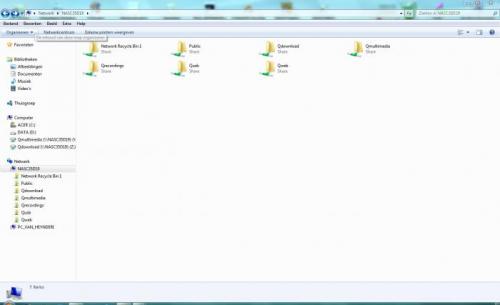 Hello Stegi --hier ben ik weer ! Heb gedaan zoals uitgelegd in uw vorige antwoord , ik ga naar computer , netwerk , Nasc35d19 , en klik daarop en dan krijg ik verbinding , en kan ik ook naar qweb --qmultimedia enz enz . Zie bijlage . Dat is allemaal geen probleem . Mijn probleem is uploaden van verschilende bestanden tegelijk ! Mijn Documenten , video's afbeeldingen enz enz -- alles in een klik uploaden naar de Nas , dat is mijn bedoeling , of is dat niet mogelijk ? B.v. -- in bibliotheken de volledige map afbeeldingen uploaden naar de Nas Op welke manier sluis jij je bestanden naar uw Nas ? Sorry Stegi als ik iets mis . Rob.