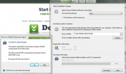 Bij het proberen te downloaden van Macrium Reflect krijg ik de melding (zie bijlage) "The option selected for download contains WinPE Components from Microsoft. The Microsoft WinPE component download will be 162,9 MB in size. Proceed with the download?" Daar ik niet weet wat de consequenties zijn als ik de download doorzet, heb ik het niet gedaan. Het lijkt er op dat men immers met deze vraag twijfel zaait of het wel verstandig is om de download door te zetten. Dus graag eerst advies hierover. Het ziet er overigens naar uit dat ook dit programma niet gratis zal zijn. De site waar je dit kunt downloaden is nl. dezelfde als van Paragon Back up and Recovery. Morgen zal ik EaseUS Todo Backup proberen. PS. Inmiddels ook het programma My PC-Backup verwijderd.