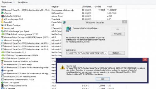 Als ik op verwijderen duw van de 2010 versie x86 krijg ik de melding die je hierboven ziet. Het lijkt eig dat het programma niet meer op men pc staat maar wel nog tussen de lijst van programma's -