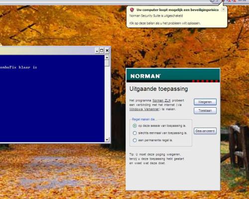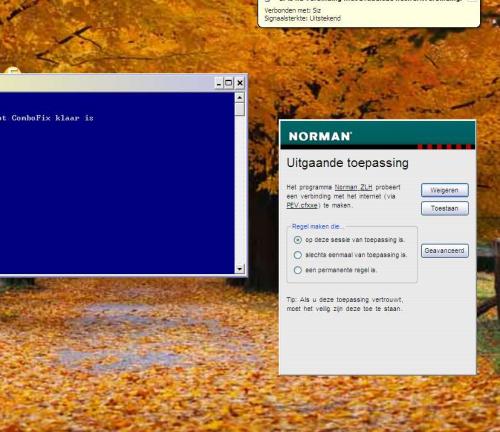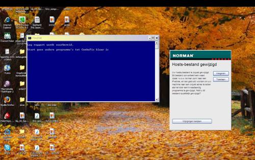 hai Kape! thanxs voor je snelle reply! het duurde even voordat ie de scan gemaakt had, maar na het opnieuw opstarten kreeg ik eerst de volgende melding: (terwijl het "dos"schermpje zei dat combofix lograpport wordt voorbereid) van norman (wel alles uitgeschakeld bij instellingen van norman voor ik combofix d/l) norman host betsnad is veranderd en wordt omgeleid naar ip adres toestaan/weigeren, heb ik op weigeren gedrukt, daarna vroeg pev.cfxxe om toestemming met internet ook geweigerd. daarna kwam melding van combofix kan bestand c:\docume~1\admini niet vinden nieuw bestand? ja geklikt. moet ik nu die combofix opnieuw installeren? thanxs Kape! gr