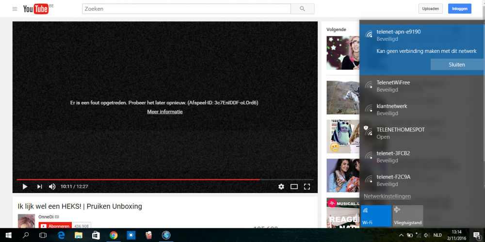 11. Beste Net is de verbinding plots weer verbroken. De afbeelding geeft de situatie weer. Het kwam niet door in slaapstand te gaan, het gebeurde gewoon tijdens het kijken van een youtube video. Wel is het zo dat het op te lossen is door te laptop opnieuw op te starten of even in standby te zetten, en dan weer te laten ontwaken. Het houdt er dus verband mee.
