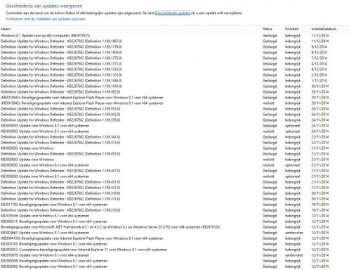 Gaat niet. De cursor blijft pinken en verder gebeurt er helemaal niks. Gisteren heb ik bovendien ook melding gekregen van 13 Windows updates, die ik allemaal handmatig geinstalleerd heb, en vandaag krijg ik bij het bekijken een foutmelding dat er al 30 dagen niet naar updates gezocht is geweest. Wat niet kan, want ik heb elke dag manueel controles uitgevoerd om te zien of er nog updates waren (sinds ik Bitdefender helemaal heb uitgeschakeld, sta ik op windows firewall en defender, dat je elke dag MOET updaten en bijwerken.) En nu zie ik tegelijk in de updategeschiedenis dat alle updates die ik zo tot 09/12/2014 heb uitgevoerd toch zijn geinstalleerd, maar de 13 die ik op 10/12/2014 gecontroleerd heb geinstalleerd er NIET tussen staan ??? En toch zou er 30 dagen niks zijn geinstalleerd ? Fucking shit hell no ! WTF Microsoft ??? WTF Windows 8.1 ??? Als er dus een update geinstalleerd is geweest gisteren die een probleem geeft, dan kan ik dus niet weten om welke update het zou kunnen gaan, want die van gisteren staan dus niet in de updategeschiedenis !!! Hoe moet ik nu weten of die ja dan neen geinstalleerd zijn ???