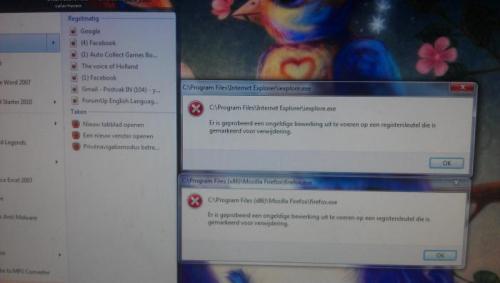 Please help! Virus - waarschijnlijk een rogue.Yvontje82 reageerde op Yvontje82's topic in Archief Bestrijding malware & virussen Beste, Ik heb niet zo goed nieuws. Combofix is inmiddels klaar en heeft een log gemaakt, maar ik kan nu geen programma's meer openen. Geen internet, geen paint, geen word, geen youtubeconverter, geen calculator. Ik kan de log dan ook niet posten. Gelukkig heb ik wel internet op mijn mobiel . Ik zag aan het begin van combofix dat er een systeemherstelpunt werd aangemaakt. Configuratiescherm kan ik wel nog openen. Ik neem aan dat ik alles weer moet terug zetten. Zie foto voor de meldingen die ik kreeg. Hopelijk is het voldoende leesbaar. In afwachting van een antwoord doe ik nu verder even niets. Met vriendelijke groet, Yvonne