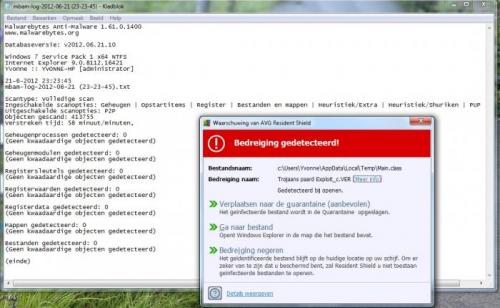 21. Beste, Ik heb vandaag MBAM een volledige scan laten draaien. Hij gaf aan dat er geen detecties waren. (Heb vandaag ook het programma geupdate vóór de scan). Aan het einde krijg ik toch een waarschuwing AVG. Zie de bijgevoegde foto. inmiddels heb ik het bestand in quarantaine geplaatst. Zou je mij kunnen adviseren over te nemen vervolgstappen of ben ik nu toch "gedekt"? Met vriendelijke groet, Yvonne Hierbij de LOG: Malwarebytes Anti-Malware 1.61.0.1400 www.malwarebytes.org Databaseversie: v2012.06.21.10 Windows 7 Service Pack 1 x64 NTFS Internet Explorer 9.0.8112.16421 Yvonne :: YVONNE-HP [administrator] 21-6-2012 23:23:45 mbam-log-2012-06-21 (23-23-45).txt Scantype: Volledige scan Ingeschakelde scanopties: Geheugen | Opstartitems | Register | Bestanden en mappen | Heuristiek/Extra | Heuristiek/Shuriken | PUP | PUM Uitgeschakelde scanopties: P2P Objecten gescand: 413755 Verstreken tijd: 58 minuut/minuten, Geheugenprocessen gedetecteerd: 0 (Geen kwaadaardige objecten gedetecteerd) Geheugenmodulen gedetecteerd: 0 (Geen kwaadaardige objecten gedetecteerd) Registersleutels gedetecteerd: 0 (Geen kwaadaardige objecten gedetecteerd) Registerwaarden gedetecteerd: 0 (Geen kwaadaardige objecten gedetecteerd) Registerdata gedetecteerd: 0 (Geen kwaadaardige objecten gedetecteerd) Mappen gedetecteerd: 0 (Geen kwaadaardige objecten gedetecteerd) Bestanden gedetecteerd: 0 (Geen kwaadaardige objecten gedetecteerd) (einde)