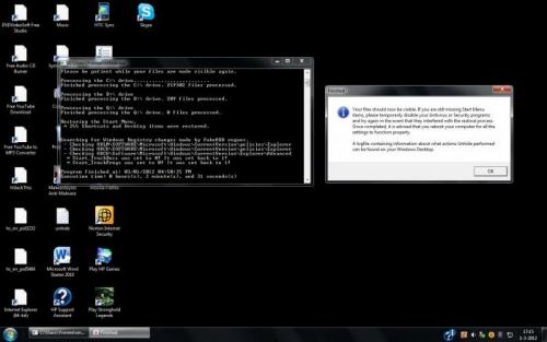 4. Beste, Ik heb volgens mij een rogue op mijn PC staan, die (hopelijk) al mijn bestanden en programma's aan mij zicht heeft verborgen. Met behulp van MBAM heb ik al enkele bestanden verwijderd, maar nog steeds blijft mijn beeldscherm een zwarte achtergrond geven, bureauaccesoires (oa) is niet zichtbaar, mijn "Mijn-documenten"-map is verdwenen. Zie hieronder mijn MBAM-log: Malwarebytes Anti-Malware 1.60.1.1000 www.malwarebytes.org Databaseversie: v2012.02.29.04 Windows 7 Service Pack 1 x64 NTFS Internet Explorer 9.0.8112.16421 Yvonne :: YVONNE-HP [administrator] 29-2-2012 19:52:10 mbam-log-2012-02-29 (19-52-10).txt Scantype: Volledige scan Ingeschakelde scanopties: Geheugen | Opstartitems | Register | Bestanden en mappen | Heuristiek/Extra | Heuristiek/Shuriken | PUP | PUM Uitgeschakelde scanopties: P2P Objecten gescand: 376996 Verstreken tijd: 43 minuut/minuten, 15 seconde(n) Geheugenprocessen gedetecteerd: 2 C:\ProgramData\DvhhCCFbLujqW.exe (Rogue.FakeHDD) -> 3512 -> Zal worden verwijderd tijdens het herstarten. C:\ProgramData\rJqTsIIgix2BHg.exe (Trojan.FakeAlert) -> 5112 -> Zal worden verwijderd tijdens het herstarten. Geheugenmodulen gedetecteerd: 0 (Geen kwaadaardige objecten gedetecteerd) Registersleutels gedetecteerd: 0 (Geen kwaadaardige objecten gedetecteerd) Registerwaarden gedetecteerd: 1 HKCU\SOFTWARE\Microsoft\Windows\CurrentVersion\Run|DvhhCCFbLujqW.exe (Rogue.FakeHDD) -> Data: C:\ProgramData\DvhhCCFbLujqW.exe -> Succesvol in quarantaine geplaatst en verwijderd. Registerdata gedetecteerd: 2 HKCU\SOFTWARE\Microsoft\Windows\CurrentVersion\Explorer\Advanced|Start_ShowMyComputer (PUM.Hijack.StartMenu) -> Slecht: (0) Goed: (1) -> Succesvol in quarantaine geplaatst en gerepareerd. HKCU\SOFTWARE\Microsoft\Windows\CurrentVersion\Explorer\Advanced|Start_ShowSearch (PUM.Hijack.StartMenu) -> Slecht: (0) Goed: (1) -> Succesvol in quarantaine geplaatst en gerepareerd. Mappen gedetecteerd: 0 (Geen kwaadaardige objecten gedetecteerd) Bestanden gedetecteerd: 4 C:\ProgramData\DvhhCCFbLujqW.exe (Rogue.FakeHDD) -> Zal worden verwijderd tijdens het herstarten. C:\ProgramData\rJqTsIIgix2BHg.exe (Trojan.FakeAlert) -> Zal worden verwijderd tijdens het herstarten. C:\Users\Yvonne\AppData\Local\Temp\1c2Tg39napEMIj.exe.tmp (Rogue.FakeHDD) -> Succesvol in quarantaine geplaatst en verwijderd. C:\Users\Yvonne\AppData\Local\Temp\oncwmxraes.exe (Rogue.FakeHDD) -> Succesvol in quarantaine geplaatst en verwijderd. (einde)