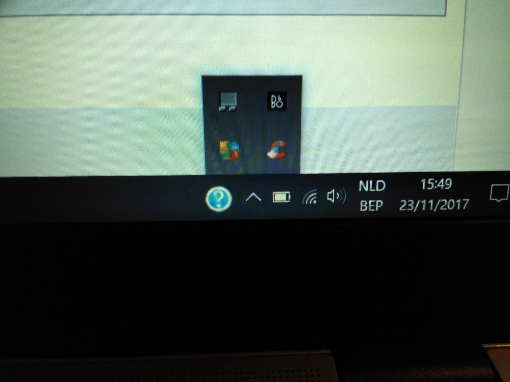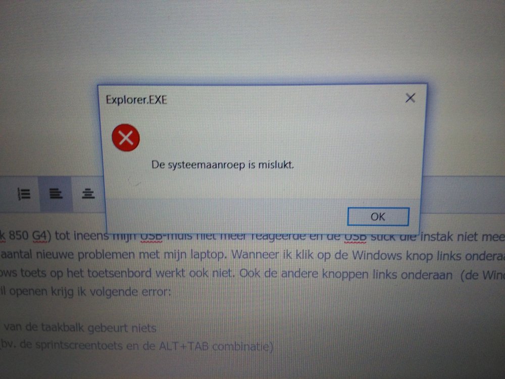 Ik was gewoon aan het werken op mijn laptop (HP Elitebook 850 G4) tot ineens mijn USB-muis niet meer reageerde en de USB-stick die instak niet meer werd herkend. Ik startte mijn laptop dus opnieuw op waarna de muis en USB stick wel terug werkten, maar nu heb ik een aantal nieuwe problemen met mijn laptop. Wanneer ik klik op de Windows knop links onderaan het scherm gebeurt er niets, ik krijg het startmenu dus niet geopend. Het startmenu openen door middel van de Windows toets op het toetsenbord werkt ook niet. Ook de andere knoppen links onderaan (de Windows zoekknop en het tabbladen icoontje) werken niet meer. Ook rechtermuisklikken op eender welk icoontje in het linker deel van de taakbalk (dus ook bij geopende programma's) werkt niet... Wanneer ik de ingebouwde mail applicatie van Windows wil openen krijg ik volgende error: Ik merk ook dat sommige sneltoetsen niet meer werken, bv. de printscreentoets en de ALT+TAB combinatie. Normaal krijg ik ook een icoontje op het scherm te zien als ik het volume wijzig of helemaal stil zet, ook dit verschijnt niet meer. Tussen de verborgen systeempictogrammen zie ik ook maar 4 icoontjes staan terwijl er hier normaal minstens 10 staan: (foto's zijn met de smartphone genomen aangezien de printscreentoets niet meer werkt) Iemand enig idee wat ik hier aan kan doen?