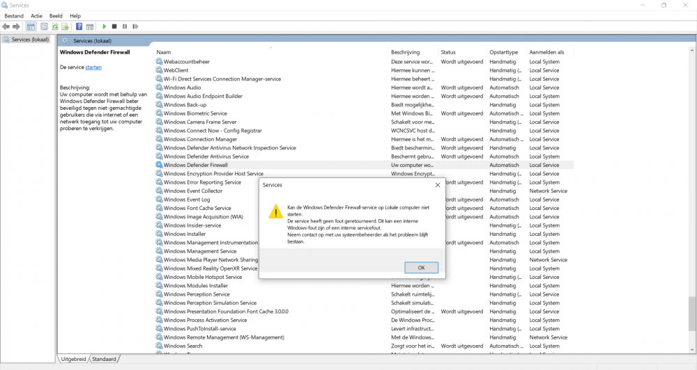 De eerste link bracht inderdaad geen oplossing. Dan heb ik de volgende stappen ook gedaan Windows controleren: a) eindigde inderdaad op "completed succesfully" b) eindigde op "er werden fouten gevonden en deze werden hersteld" Schijfcontrole: het resultaat waren allemaal groene blokjes bij mij Heb ondertussen ook al Norton voorlopig verwijderd om te zien of ik de Windows Firewall dan wel kon oplossen, maar dit heeft ook niet geholpen. Bij de Services heb ik wel gezien dat er een service Windows Defender Firewall is. Deze staat op automatisch en was nog niet gestart, wanneer ik rechtsklik en starten doe dan krijg ik deze melding: Nadien verandert de status ervan in "wordt gestart", maar dit blijft zo te zien heel de tijd zo staan (verandert niet in "wordt uitgevoerd") -