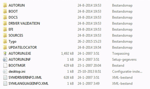 9. Kun je niet op een andere PC/laptop proberen of je stick uberhaupt wel bootable is, anders blijf je zoeken. Mijn bootable stick toont deze folders en files (met een privé folder). Of ze allemaal nodig zijn weet ik niet, maar hij werkt in elk geval wel.