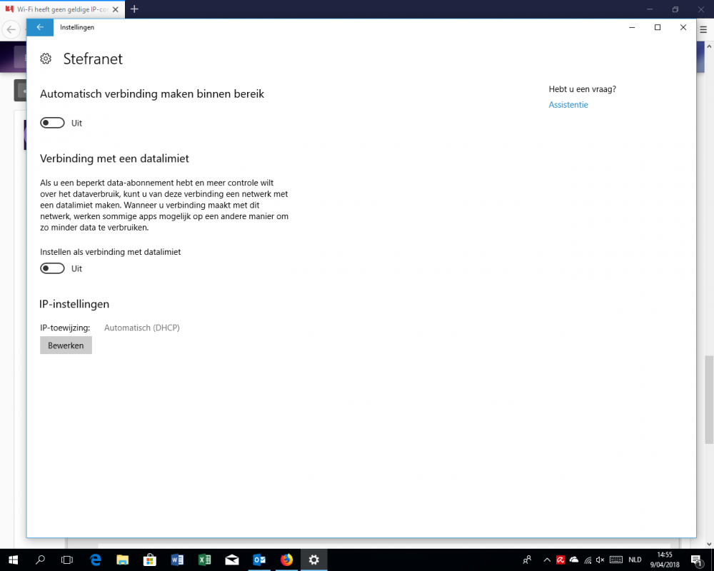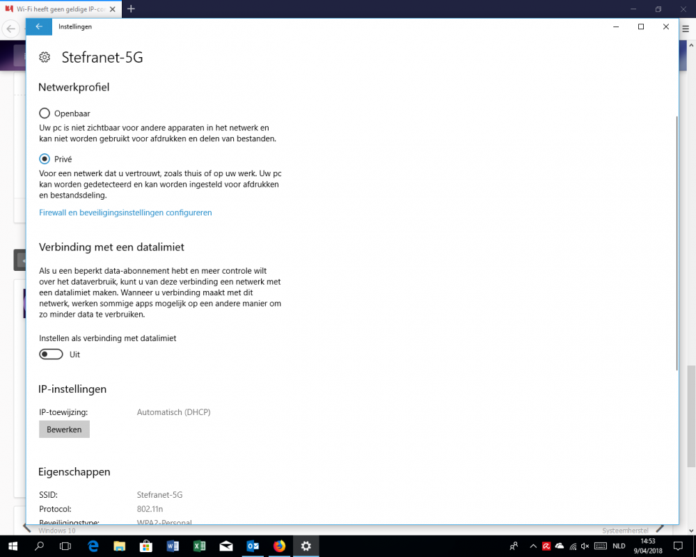 20. Dan heb je prima verbinding. Zeer vermoedelijk had je verkeerde paswoord gegeven aan de wifi signaal. Ga naar netwerkcentrum en klik op uw wifi-signaal die je ziet en klik dan op eigenschappen van draadloos netwerk Klik op tab beveiliging en stelt het in zoals afbeelding en dan OK Nu moet opnieuw een paswoord geven als wifi signaal verbinding wilt maken. Je mag ook een andere SSID naam geven maar dan moeten alle toestellen opnieuw een verbinding maken en paswoord geven. Weet je de paswoord niet dan kan je bij een ander pc of laptop in tab beveiliging tekens aanvinken zodat ***** zichtbaar wordt.