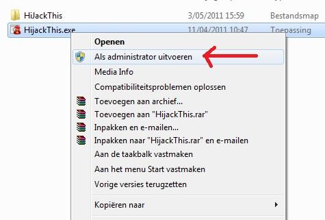 Je hebt XP en dan moet je niet met de rechtermuisknop op run as administrator doen maar gewoon klikken op HiJackThis.exe en dan wat dan wat kweezie wabbit in bericht 11 vermeld doen. Nota: bij Windows XP bestaat niet run as administrator