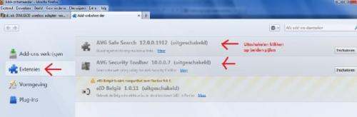 5. Hebt je dit ook gedaan? Klik op EXTRA en dan ADD-ons en dan klik je daar op extenties en dan kan je AVG uitschakelen. Dan in de browser nog eens op x klikken om de toolbar te verwijderen.