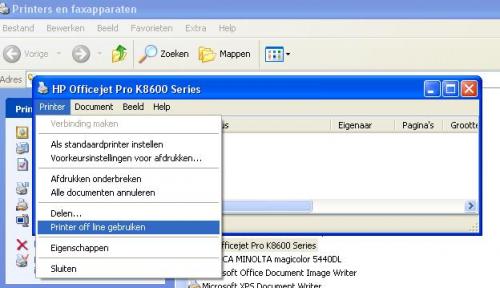 Ga naar desktop Ga naar printer en dubbelklik op de printer. Mogelijk staan daar taken. Mogelijk staat het het daar Printer / printer offline gebruiken aangevinkt.