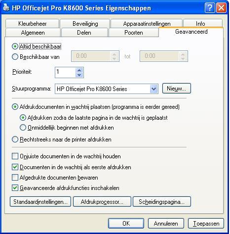 Vanuit de laptop doet je draadloos printen en dat duurt altijd langer. Maar het afdrukken zelf zou in principe zoals de pc moeten zijn. Misschien is het dit: Klik op printer en dan eigenschappen. Klik op tab gavanceerd Is dat zo ingesteld zoals afbeelding. Maar het kan ook een malware zijn. Download HijackThis. Klik bij "HijackThis Downloads" op "Installer". Bestand HijackThis.msi opslaan. Daarna kiezen voor "uitvoeren". Hijackthis wordt nu op je PC geïnstalleerd, een snelkoppeling wordt op je bureaublad geplaatst. Klik op de snelkoppeling om HijackThis te starten Klik ofwel op "Do a systemscan and save a logfile", ofwel eerst op "Scan" en dan op "Savelog". Er opent een kladblokvenster, hou gelijktijdig de CTRL en A-toets ingedrukt, nu is alles geselecteerd. Hou gelijktijdig de CTRL en C-toets ingedrukt, nu is alles gekopieerd. Plak nu het HJT logje in je bericht door CTRL en V-toets. Let op : Windows Vista & 7 gebruikers dienen HijackThis als “administrator” uit te voeren via rechtermuisknop “uitvoeren als administrator". Indien dit via de snelkoppeling niet lukt voer je HijackThis als administrator uit in de volgende map : C:\Program Files\Trend Micro\HiJackThis