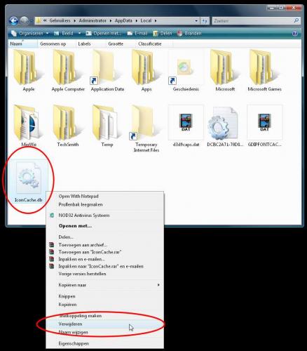 3. Uiteindelijk draait alles om het bestanden 'IconCache.db' dat is te vinden in de map 'C:Gebruikers<uw naam>AppDateLocal' (zie afbeelding) . Eerst zorgt u – via een venster van de Windows Verkenner – er voor dat u de verborgen en de systeemmappen te zien krijgt. Inderdaad, dat gaat via de 'Mapopties' en het tabblad 'Geavanceerd'! Daarna gooit u het genoemde bestand weg... Vervolgens de PC opnieuw starten en dan zijn alle iconen weer netjes! [ATTACH]5155[/ATTACH]