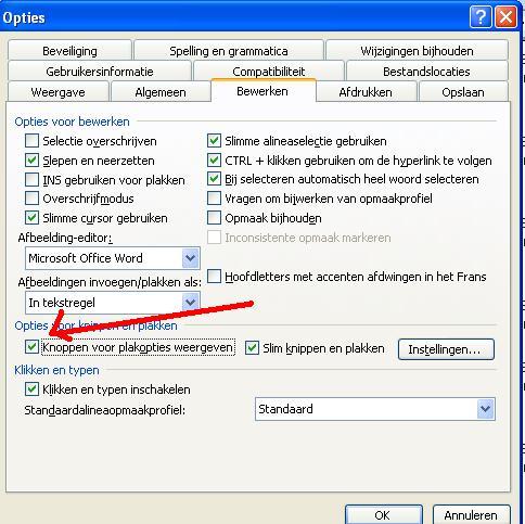 Het was wel even zoeken maar je moet selecteren wat in afbeelding staat indien je Word 2003 gebruikt.
