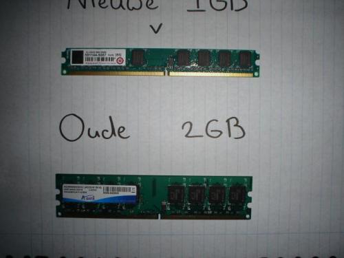 De latje dat overbleef deed het prima verder dus heb maar besloten en nieuw latje te kopen. Nu knal ik weer tegen een opstart probleem. Ik heb een extra latje gekocht. Deze was vrijwel identiek aan het latje dat ik heb weggehaald (en is ook identiek aan het latje dat ik nog gebruik). Zowel beiden waren 1GB, 800Mhz, DDR2 en 240-pins. Nu plaats ik deze in hetzelfde slotje maar nu wil mijn computer niet meer fatsoenlijk opstarten. Ik heb de latjes verwisselt en dit zijn de resultaten. Slot 1: Oude latje van 2GB Slot 2: Nieuwe latje van 1GB Resultaat: Computer start op. Ik kan in de Bios komen en deze leest prima 3GB aan geheugen maar als hij Windows Vista op start dan blijft hij vastlopen bij het laadbalkje. Deze blijft oneindig door laden, toetsenbord reageert niet (numlock bv). Slot 1: Oude latje van 2GB Slot 2: Leeg Resultaat: Computer werkt prima. Slot 1: Nieuw latje van 1GB. Slot 2: Leeg Resultaat: Computer werkt prima. Slot 1: Nieuw latje van 1GB. Slot 2: Oud latje van 2GB. Resultaat: Computer start helemaal niet op. Het enige verschil tussen de twee latjes is dat mijn oude latje U-DIMM is en mijn nieuwe latje DIMM maar ik las toen ik de verschillen opzocht niets over dat ze niet samen werkten. Hoe kan ik ervoor zorgen dat het alsnog samen werkt? Veilige modus werkt ook niet. Hij laad tot crcdisk.sys en vervolgens gebeurd er niets.