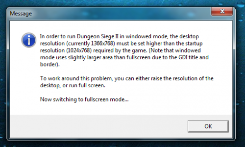 Ik probeer een spel te spelen in windowed mode, het gaat hier om het spel Dungeon Siege II. Ik doe dit omdat het spel mijn native resolutie van 1366x768 niet ondersteunt. Nu heb ik de resolutie van het spel aangepast naar 800x600 en in de command line parameters heb ik het command staan dat het spel geforceerd in een window moet. Geen probleem dacht ik. Als ik dat doe krijg ik echter een pop-up dat aangeeft dat de resolutie van mijn computerscherm groter moet zijn dan de start resolutie van het spel (1024x768). Nu is dit heel erg vervelend aangezien ik het spel gewoon in 800x600 start. Blijkbaar start het spel eerst op in 1024x768 voordat het veranderend naar 800x600. (Zowel de .ini van de applicatie geeft de resolutie van 800x600 aan als de graphics menu in het spel.) Nu is mijn vraag of ik iets kan doen aan mijn Windows 7 waardoor deze aangeeft dat de resolutie hoger is. Hierdoor gaat die pop-up wellicht weg en kan ik het wel in een window van 800x600 spelen. (Ik snap prima dat de resolutie niet hoger kan dan mijn native resolutie. Ik wil alleen dat applicaties denken dat ik wel een hogere resolutie heb.) Als iemand echter een andere methode heeft om deze message weg te halen dan is dat ook prima. Ik heb zelf niet iets kunnen vinden op het internet. -