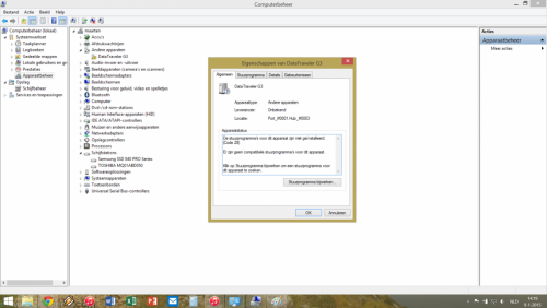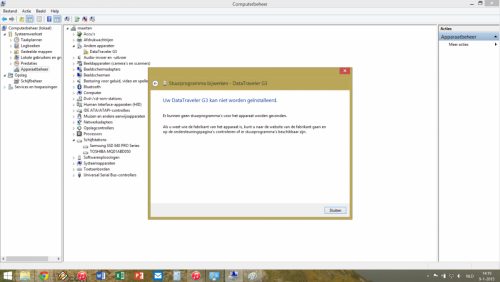5. Extra info De USB-stick: "DataTraveler G3 16GB" Externe HDD: "500 GB Argosy mobile video HDD HV356TB" Moederbord: "ASUSTeK COMPUTER INC. N56VJ" Processor: "Intel Core i5 3320M @ 2600 MHz (max : 3200)" OS: Windows 8.1 Pro Eerder werkte beide apparaten wel op dit systeem. En ook nu nog doet i.i.g. de externe HDD het op een andere laptop, stick nog niet geprobeerd. Net bij "apparaat beheer" > "universal serial bus-controllers" alle installaties ongedaan gemaakt en Windows opnieuw opgestart. Windows heeft alle drivers opnieuw geïnstalleerd, maar het probleem is nog niet verholpen. "USB-apparaten voor massaopslag" staat en stond overigens niet onder "universal serial bus-controllers". Kan dit het probleem zijn? Bij voorbaat dank.