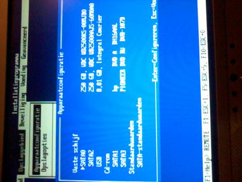 Bij apparaatconfig worden de schijven herkend. Maar bij opstartvolgorde (het is haast onleesbaar, foto snel genomen met de gsm. Slecht idee blijkbaar) Maar in die opstartvolgorde staat enkel de ingebouwde satacontroller. Niet de schijven die hij beheerd. Het zwart scherm is de bootorder via F9. Daar staat op plaats 3 enkel "hard drive". Maar ik krijg nooit de individuele schijven. Het BIOS laat dit eenvoudig niet toe denk ik. En ik heb nog niet gevonden hoe het bios aan te passen om die keuze aan mij te geven. -