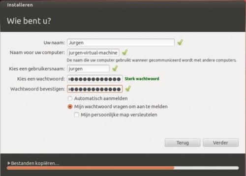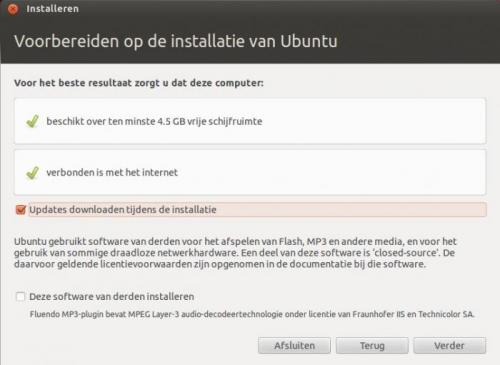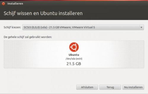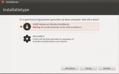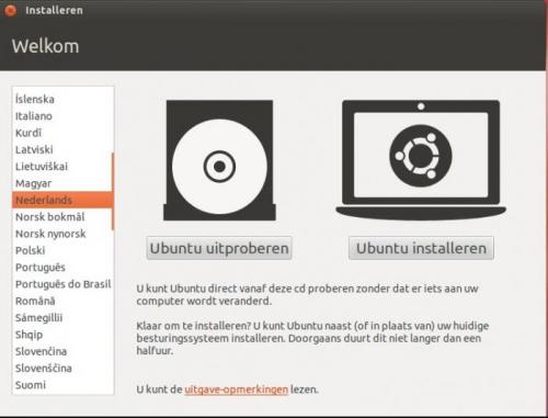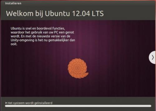 4. Het installeren van Ubuntu is heel eenvoudig. Vooraleer de installatie te beginnen is het aan te raden om te testen of je computer wel geschikt is voor Ubuntu. Indien je over een recente pc beschikt is er niet direct een probleem. Heb je een al iets ouder model, dan kunnen er problemen opduiken tijdens de installatie. Ubuntu kan immers lastig doen over je oudere hardware. Is mijn pc geschikt voor Ubuntu? Om je pc te testen is het niet nodig om extra software te installeren. Het volstaat om Ubuntu te downloaden en te branden op een cd. We spreken in dat geval van een live-cd. Zorg er wel voor dat je een opstartbare cd maakt. Deze optie kan je aanvinken in je brandprogramma. Als je er geen opstartbare cd van maakt, zal je later je pc niet kunnen opstarten via de Ubuntu-cd. Als het branden is voltooid start je de pc op vanaf de cd-rom. Eerst zal je de juiste taal moeten kiezen. Kies Nederlands en druk op Enter. Kies daarna in de rechterkant voor de optie “Ubuntu uitproberen”. Ubuntu zal nu beginnen laden. Dit laden kan enige tijd duren, omdat Ubuntu alle bestanden moet laden vanaf de cd-rom. Er wordt immers niets geïnstalleerd op je harde schijf. Heb dus even geduld. Als het laden is voltooid, kan je Ubuntu uitproberen. Hierbij zal je zelfs al over internet kunnen beschikken! Ubuntu installeren Als je geen problemen hebt gehad bij het gebruik van de live cd, kan je Ubuntu installeren op je pc. Voor je start met de installatie van Ubuntu is het aan te raden een backup te maken van je bestaande gegevens op de pc! Er kan immers altijd wel iets fout gaan. Start de pc op vanaf de cd-rom. Kies Nederlands en druk op Enter. Omdat we Ubuntu nu als volwaardig besturingssysteem op de pc willen installeren, kiezen we voor de tweede optie: “Ubuntu installeren”. De installatiewizard zal nu starten. In het volgende venster dat verschijnt kan je er voor kiezen om reeds te starten met het downloaden van updates tijdens het installeren. Je kan deze optie zonder problemen aanvinken. Het is wel vereist dat je reeds over een verbinding met het internet beschikt. Gebruik bij voorkeur een bekabelde verbinding tussen je pc en de router. De optie “Deze software van derden downloaden tijdens de installatie” hoef je niet aan te vinken. De nodige software kan ook nadien worden geïnstalleerd. Het volgende dat je te zien krijgt is “schijfindeler”. Installeer je Ubuntu op een lege harde schijf, dan krijg je het volgende te zien: Wil je geen partities aanmaken, dan kies je voor de eerste optie, “Schijf wissen en Ubuntu installeren” en klik je op “Verder”. Wil je wel je harde schijf indelen, dan kies je voor de optie “Iets anders”. In deze handleidingen, kiezen we voor een eenvoudige installatie en maken we geen partities aan. In het volgende venster krijgen we een overzicht van de harde schijf en kunnen we de installatie van Ubuntu starten door op de knop “Installeren” te klikken. In de volgende vensters kan je de tijdszone en de indeling van het toetsenbord kiezen. Om te testen of je de juiste indeling hebt gekozen, kan je onderaan iets typen. Is dit gelukt, druk dan op Vooruit om verder te gaan. Je zal opmerken dat de balk onderaan in het venster verder gaat. De installatie loopt dus gewoon door tijdens het maken van de keuzes. In de volgende stap kan je je gegevens invullen. Wanneer je een wachtwoord hebt gekozen dat korter is dan 8 tekens, zal Ubuntu je hiervoor waarschuwen. Je kan je wachtwoord dan wijzigen of kiezen om verder te gaan. Tijdens het afwerken van de installatie krijg je een overzicht van de belangrijkste programma’s die aanwezig zijn in Ubuntu. Je kan gebruik maken van de pijltjes om naar de volgende dia te gaan. Als de installatie is voltooid, zal er worden gevraagd om opnieuw op te starten. Klik hiervoor op “nu herstarten”. Er zal nu een tweede scherm verschijnen waarin gevraagd wordt om de cd-rom uit de pc te verwijderen. Doe dit en druk daarna op de Enter-toets. De pc zal nu opnieuw opstarten. Wanneer de pc opnieuw is opgestart zal er een aanmeldscherm verschijnen. Hier dien je het gekozen wachtwoord in te vullen. Bevestig dit met de Enter-toets om in te loggen. Als je de correcte gegevens hebt ingegeven, zal het bureaublad verschijnen. Standaard wordt er gebruik gemaakt van Unity als deskoptomgeving. Geef je de voorkeur aan de vorige desktopomgeving, Gnome, dan kan dit ook nog steeds. Na de installatie zijn er nog een aantal zaken waar je rekening mee moet houden of die je moet uitvoeren. Een overzicht hiervan kan je vinden op volgende website: https://sites.google.com/site/computertip/directdoen Veel plezier!
