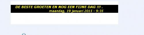 <MARQUEE bgColor=black behavior=alternate scrollAmount=1 scrollDelay=1><FONT color=red size=4 face=Verdana><STRONG>Herinner u gisteren, droom van morgen, maar…… leef vandaag !</FONT></STRONG><FONT size=1> <BR> </FONT></MARQUEE> <MARQUEE bgColor=black behavior=alternate scrollAmount=2 scrollDelay=1><A href="http://sites.google.com/site/raymondpowerpointmuziek"><FONT color=yellow size=4 face=Verdana>* Wij wensen u een zalige kerst en een gezond en sfeervol 2015 * </A> </FONT><FONT size=1><BR> </FONT></MARQUEE></DIV></DIV> <DIV><STRONG></STRONG> </DIV> <DIV> <MARQUEE bgColor=black behavior=alternate scrollAmount=1 scrollDelay=1><FONT color=yellow size=4 face=Verdana><STRONG>BESTE GROETEN VAN JEAN PAUL & CHRIS .</FONT></STRONG></MARQUEE> <MARQUEE bgColor=black behavior=alternate scrollAmount=2 scrollDelay=1><FONT color=yellow size=4 face=Verdana> <SCRIPT language=Javascript> <!-- var dayNames = new Array("zondag","maandag","dinsdag","woensdag","donderdag","vrijdag","zaterdag"); var monthNames = new Array("januari","februari","maart","april","mei","juni","juli","augustus","september","oktober","november","december"); var now = new Date(); if (now.getMinutes() < 10) minut = "0" + now.getMinutes() else minut = now.getMinutes() document.write(dayNames[now.getDay()] + ", " + now.getDate() + " " + monthNames[now.getMonth()] + " " + now.getFullYear() + " - " + now.getHours() + ":" + minut); // --> </SCRIPT> </FONT></MARQUEE></MARQUEE> <DIV></DIV></DIV> </BLOCKQUOTE></BODY></HTML>