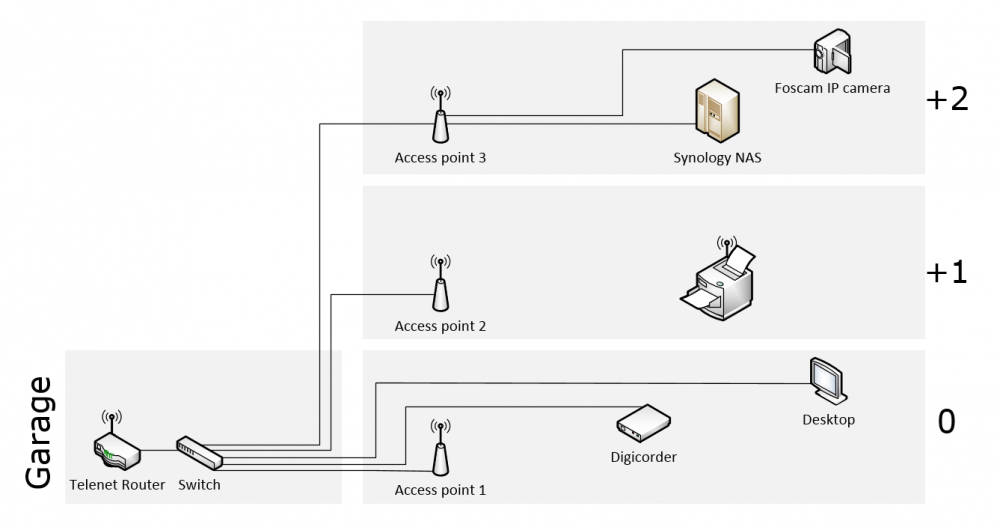 1. Hallo allen, Ik ga binnenkort in een nieuwe woning trekken, en heb enkele vragen mbt de netwerksetup die ik er moet opbouwen. Ik heb in bijlage een bestand gevoegd hoe ik het zie, maar alle suggesties zijn uiteraard welkom. Naast de aangeduide bekabeling zwerven er natuurlijk her en der nog wireless toestellen rond in het huis, zoals dat in 2017 gaat Enkele vragen die in me opkomen: Zijn er bepaalde instellingen die ik moet doen in de Telenet router? De access points per verdieping, wat koop ik hier best? Routers of access points? Bepaalde instellingen die ik moet hanteren? Zijn er apparateren die een fixed IP adres moeten krijgen? Kan ik alle netwerknamen (Telenet router + 3 access points) hetzelfde zetten, zodat ik probleemloos over de verdieping kan switchen? Moet ik iets speciaals instellen aan de Synology om er overal aan te kunnen? De Foscam camera, best bedraad of draadloos? Is er impact op het netwerk indien ik voor 1 van de 2 opties ga? Kan de digicorder ook aangesloten worden op Access Point 1 om geen switch te moeten zetten in de garage? Heeft het zin om een router/access point te kopen van >300Mbps, gezien Telenet toch max 200 haalt? Alvast heel erg bedankt voor de hulp!