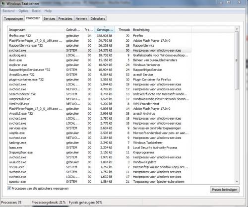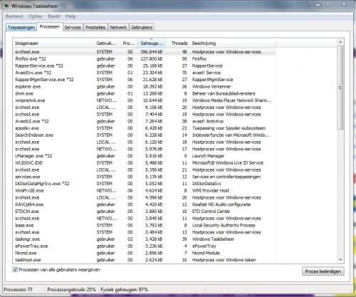 EUREKA! Het lijkt erop dat het goed werkt! Ineens geen haperingen meer, zo fijn! Fysiek geheugen rond de 70%, voornamelijk door Firefox, dus niet meer door de svchost. Ik hoop dat het zo blijft. Dank! -