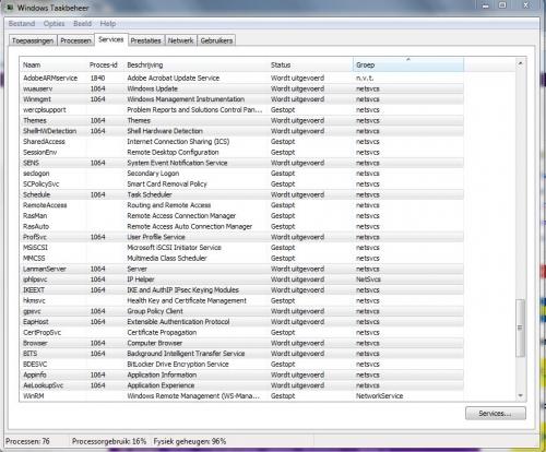 Hallo, De services heb ik uitgezet, maar ik merk geen verschil. als de computer opstart is-ie een kwartier van slag, meteen een fysiek geheugengebuik van 97%. Daarna richting 80% maar dan is er eigenlijk nog niks te beginnen. Alle programma's duren eindeloos voordat ze zijn opgestart. Heel frustrerend... -