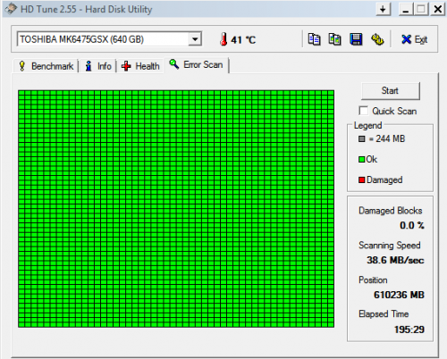 Ik heb hem gestart in veilige modus en HD tune is nu bezig. Tot nu toe is het nog groen Maakt het uit als ik me laptop tijdens de test gebruik? of heeft dat geen invloed op de resultaten?