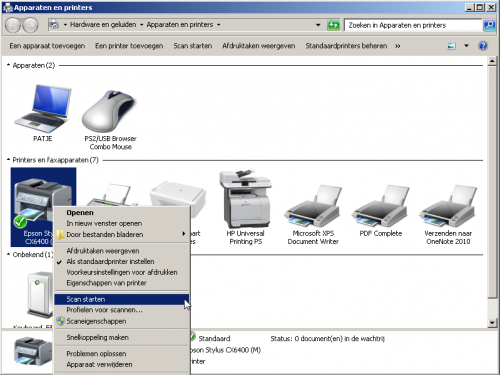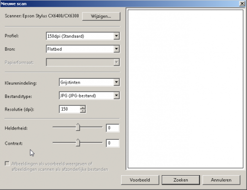 1. Beste Michiel, Ik zat met hetzelfde probleem. Inkt op van 1 van de cartridges. Ik had ook geen zin om nieuwe te kopen omdat dit zo duur is. Dus ikwilde ook enkel kunnen scannen met mijn Epson Stylus CX6400(all-in-one). Normaal gebruik je de scan functie op de printer zelf. Wat je moet doen is naar je printer gaan in printers en scanners. Je doet rechter muisklik op je printer en selecteer je 'scan starten' Daarna krijg je je scan menu en kan je instellingen veranderen indien nodig. Je klikt gewoon op 'voorbeeld' of 'zoeken' en de scanner start en scant Ik heb screenshots toegevoegd. Veel scanplezier. Keep it positive, Patrick